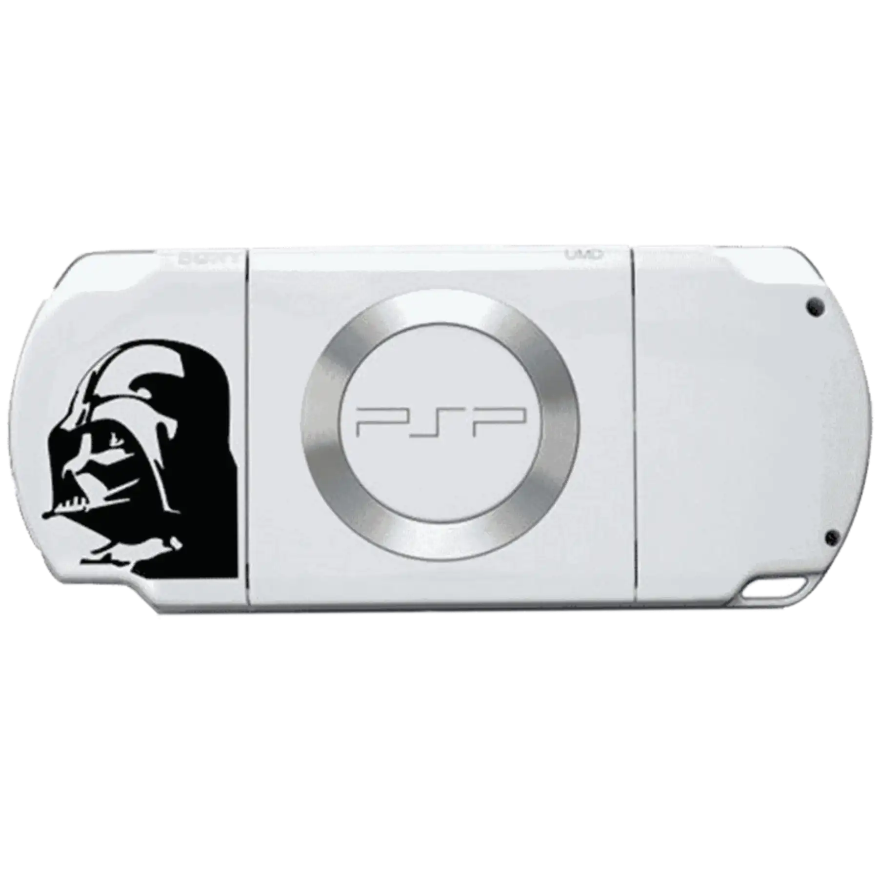 The Sony PSP 2000 Star Wars Battlefront Edition is a special limited-edition handheld console designed for Star Wars fans and gamers alike. It features an exclusive white PSP body with a Darth Vader graphic on the back, giving it a bold and collectible look.